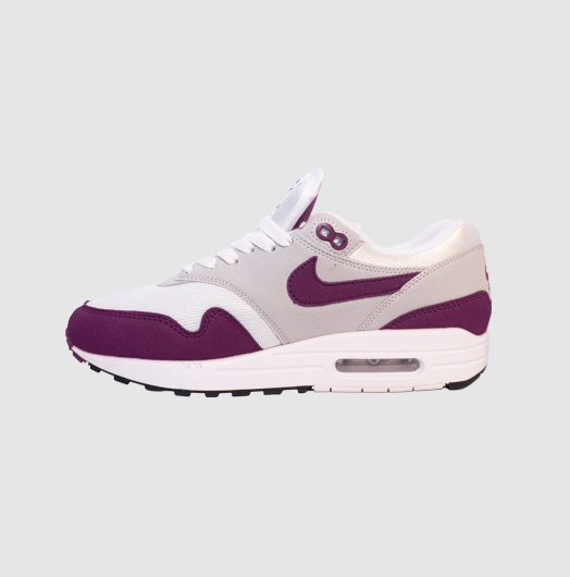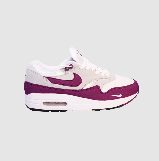 Las Air Max 1 ’87 “Bold Berry / Neutral Grey” recuperan el espíritu OG de la silueta, pero aportan frescura con un colorway potente. Su parte superior mezcla paneles en malla blanca en la puntera, overlays de suede berry-morado (Bold Berry) en mudguard, para los ojales y Swoosh, y detalles en Neutral Grey que equilibran visualmente el diseño. Un detalle que la convierte en una pieza especial es el mini Swoosh en el frontal del mudguard, lo que le da ese guiño premium tinte nostálgico. La unidad de Air visible en el talón proporciona amortiguación característica, mientras que la mediasuela blanca limpia realza la paleta y la suela de goma en negro ofrece contraste.