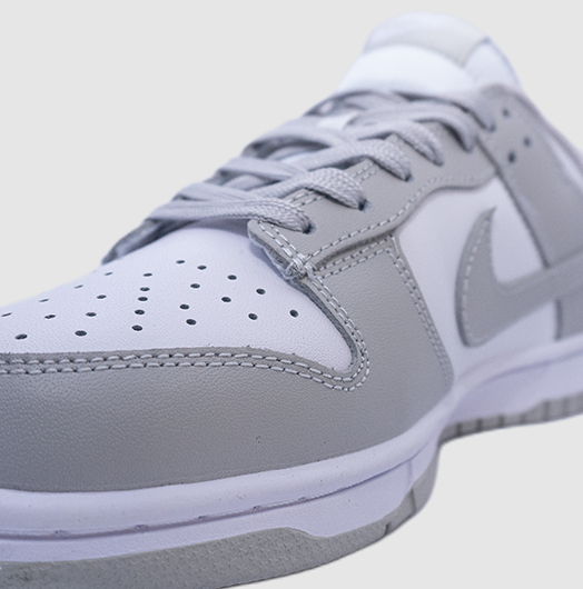 En cuanto a materiales, estas Dunk Low cuentan con una construcción en cuero premium de alta calidad, ofreciendo durabilidad, estructura y un acabado sofisticado. La base blanca resalta los overlays en gris —ubicados en el mudguard, Swoosh, talón y sistema de cordones— creando un contraste equilibrado que mantiene una estética sobria pero con carácter.