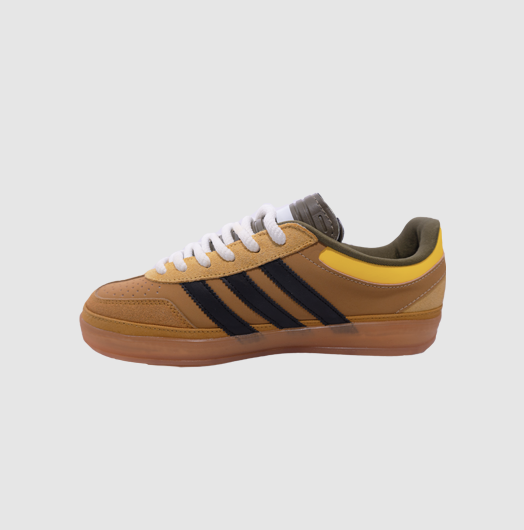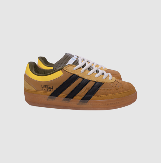 Las Gazelle Indoor “Sulfur” × Bad Bunny son una pieza conceptual dentro de la continua colaboración entre el artista y la marca, anticipando una nueva fase creativa en el 2025. Este prototipo combina un cuerpo en tono burnt sienna (ocre quemado) con aplicaciones en oliva en la lengüeta y elementos beige en ojales y suela, generando una estética natural y equilibrada.