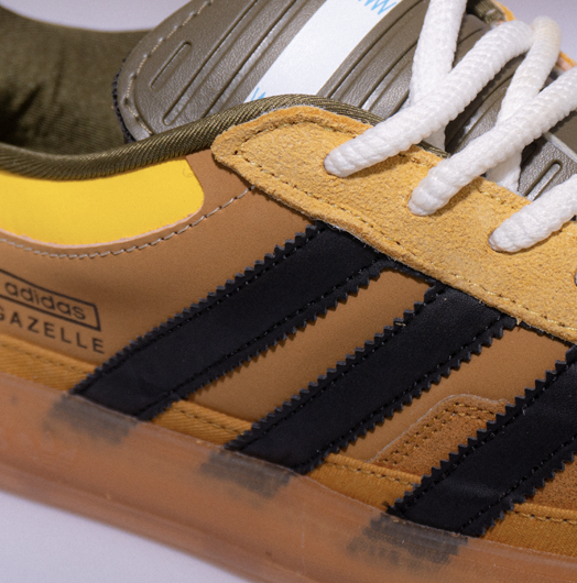 Las Gazelle Indoor “Sulfur” × Bad Bunny fusionan una paleta terrosa sofisticada—omapiel quemado con acentos olivo y beige—con detalles disruptivos como la puntera con T volteada, costuras zigzagueantes y remates cerúleos en los cordones—una mezcla perfecta entre cultura urbana y estilo sublime.