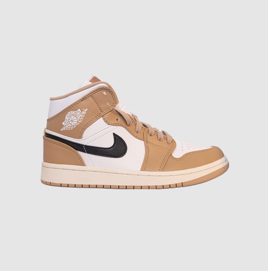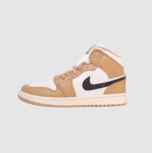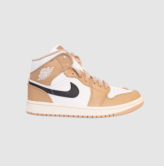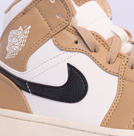 Las Air Jordan 1 Mid “Desert” reinterpretan la clásica silueta Mid con una paleta de colores tierra que captura la esencia del otoño. Su parte superior en cuero blanco (“Sail”) sirve de lienzo limpio para contrastar con overlays en Desert / Tan que recubren la puntera, ojales, collar y talón. El Swoosh en negro añade profundidad visual que refuerza su carácter. La mediasuela cremosa aporta ese estilo vintage y ligeramente envejecido, mientras que la suela de goma canela (“desert tan”) brinda tracción y complementa la gama de tonos terrosos.