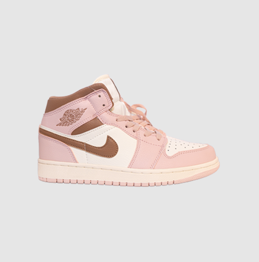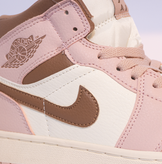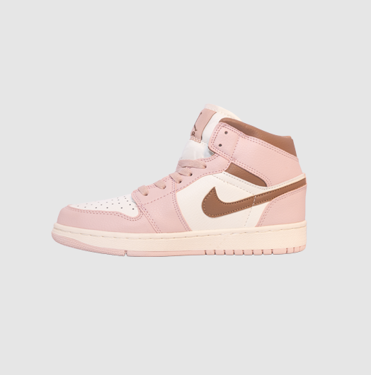 Las Air Jordan 1 Mid “Pink Oxford / Archaeo Brown / Sail” (estilo BQ6472-620) son una versión SE pensada para quienes buscan un equilibrio entre ternura y presencia. Sobre una base de cuero blanco pulido, se sitúan overlays de gamuza rosa (‘Pink Oxford’) que cubren puntera, ojales y zona frontal del collar, mientras que los paneles traseros y otros detalles vienen en tono tierra (“Archaeo Brown”) que aporta profundidad visual. La mediasuela en color Sail (cremita) suaviza el contraste entre los colores y refuerza el look retro, mientras que la suela de goma combina con la paleta general para mantener uniformidad. Perforaciones en la puntera aseguran ventilación, y el collar acolchado da soporte cómodo.
