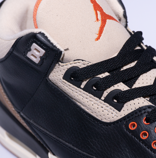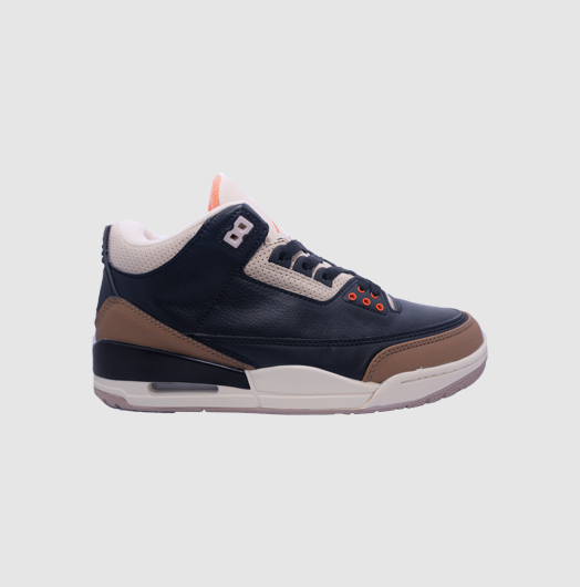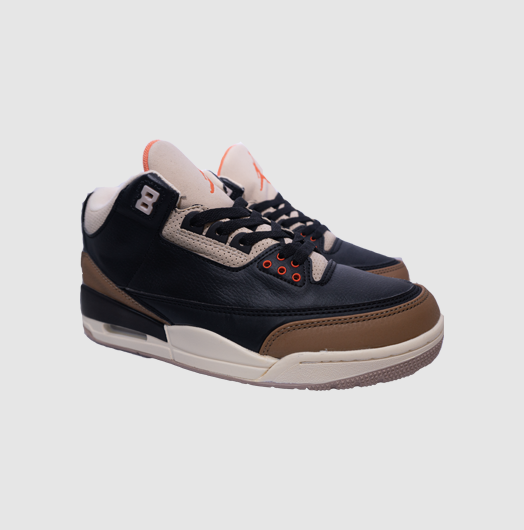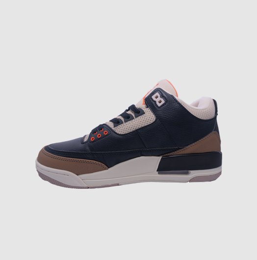 Las Air Jordan 3 Desert Elephant toman la icónica silueta diseñada por Tinker Hatfield en 1988 y la reinterpretan con un estilo sofisticado. Este par combina cuero negro premium en la parte superior con los característicos paneles de elephant print, ahora reimaginados en tonos marrón desierto que aportan calidez y un aire vintage. Los detalles en naranja y beige resaltan en la lengüeta y el talón, creando un contraste perfecto con la base oscura. La unidad Air visible en el talón asegura comodidad y amortiguación, mientras que la suela mantiene el ADN clásico de las Jordan 3. Un par que une historia, lujo y un look versátil para cualquier ocasión.