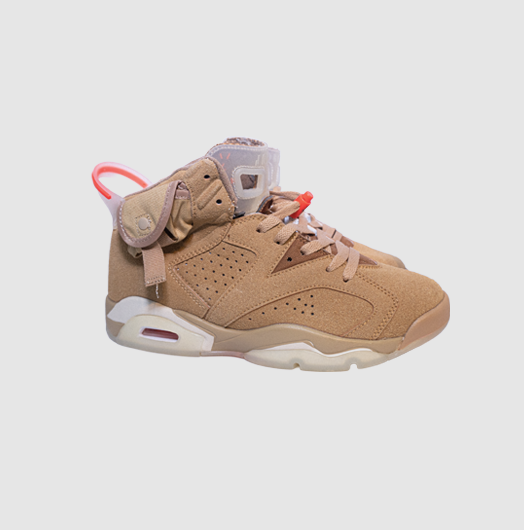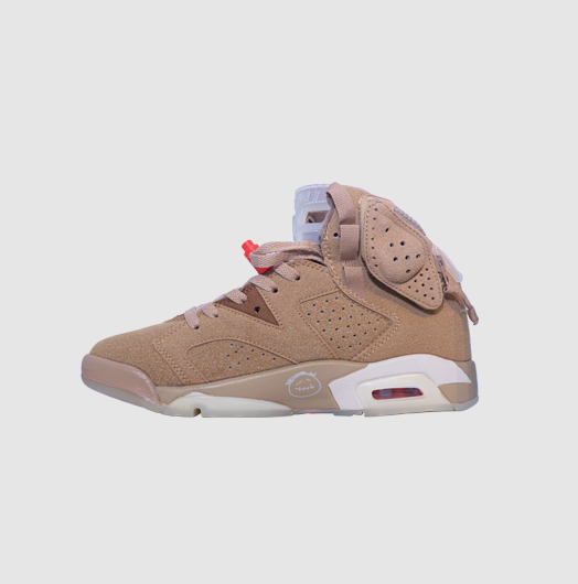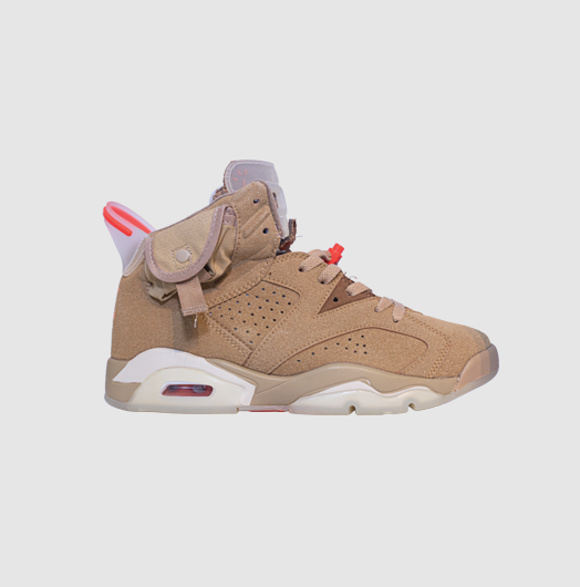 Las Jordan 6 Retro x Travis Scott “British Khaki” son el resultado de la segunda colaboración del rapero con esta silueta clásica. Lanzadas el 30 de abril de 2021, se convirtieron en una de las ediciones más buscadas de la línea Travis Scott x Jordan.