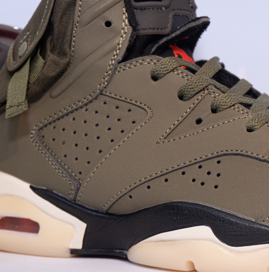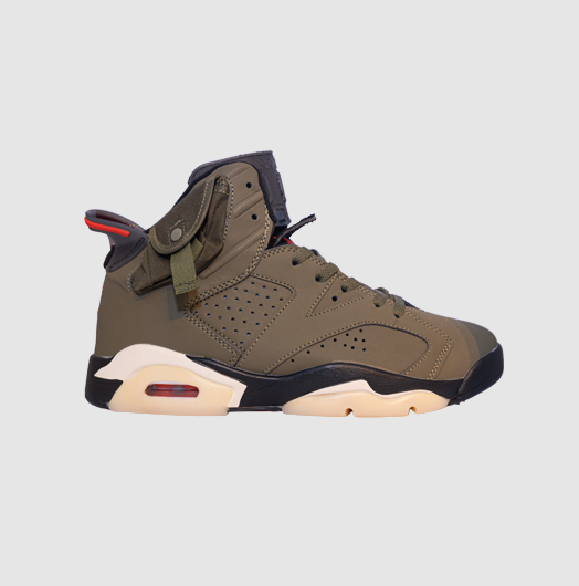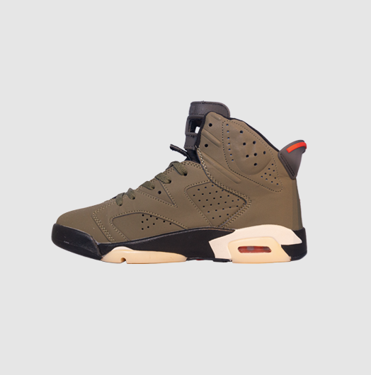 El modelo Air Jordan 6 Retro “Travis Scott” (British Khaki / Medium Olive / Bright Crimson) es una colaboración de alto perfil entre Travis Scott y Jordan Brand, lanzada en abril de 2021.