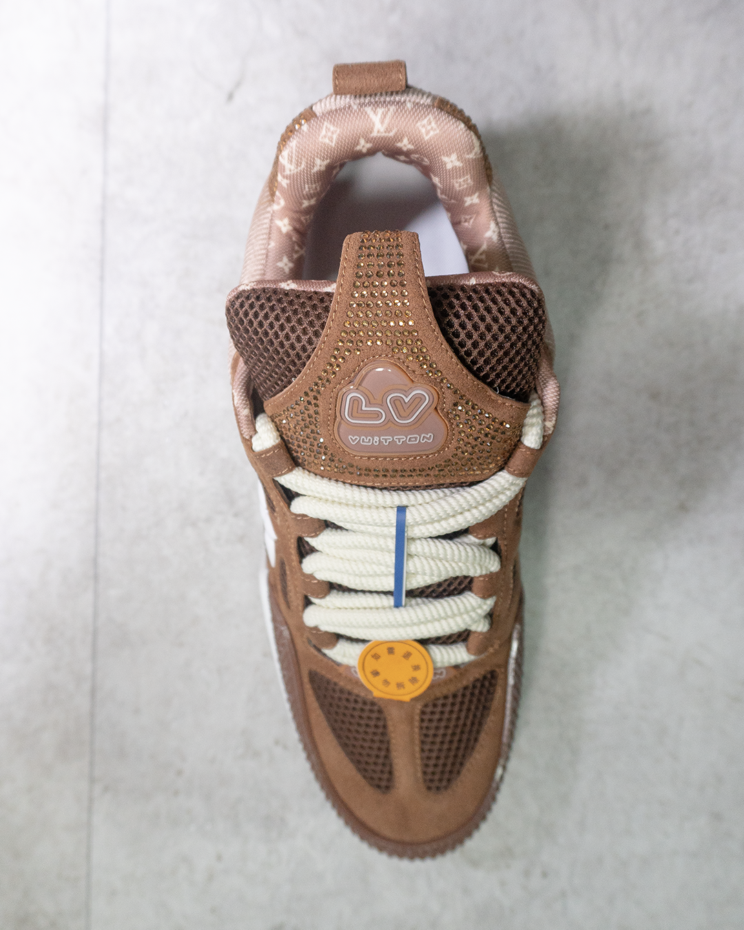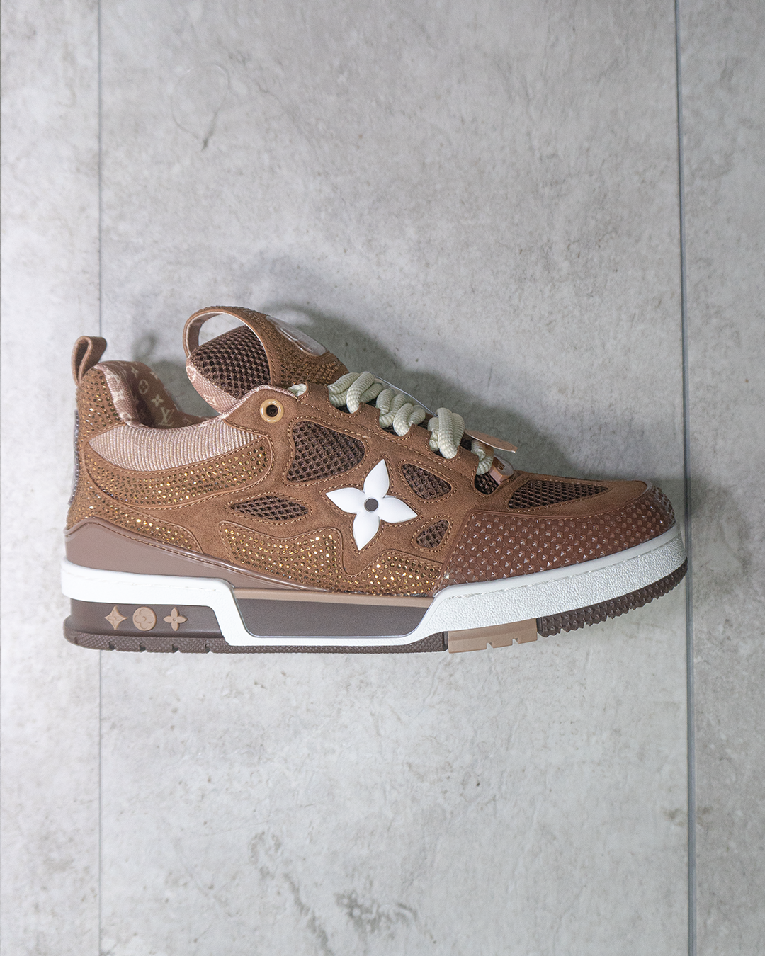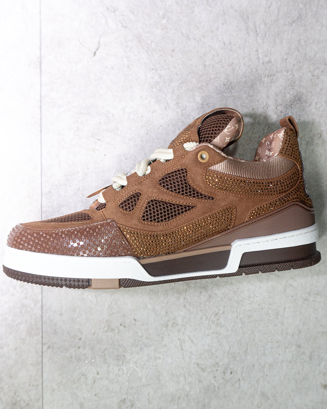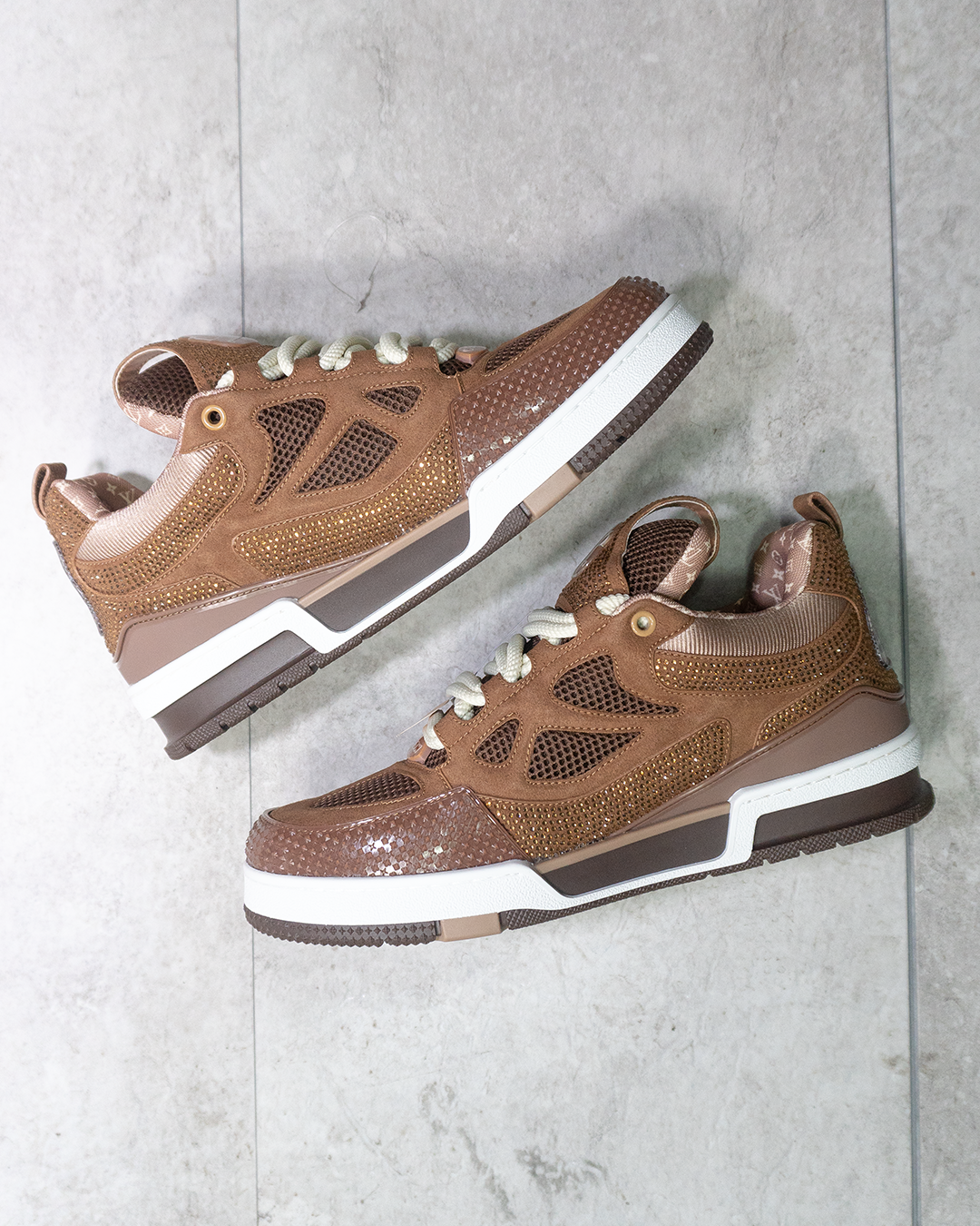 En cuanto a materiales, estas LV Skate Trainers destacan por su construcción en cuero premium de alta calidad, combinado con paneles en gamuza (suede) que aportan textura y profundidad visual. El acabado en tono marrón “Luxury Brown” refuerza su carácter sofisticado, mientras que los detalles como el monograma sutil, costuras marcadas y acabados acolchados elevan la percepción de exclusividad.