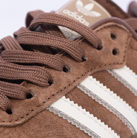 El upper de gamuza marrón suave se mezcla con las tres franjas en cuero blanco envejecido, mientras el contrafuerte blanco aporta equilibrio y un guiño al ADN clásico del modelo.
