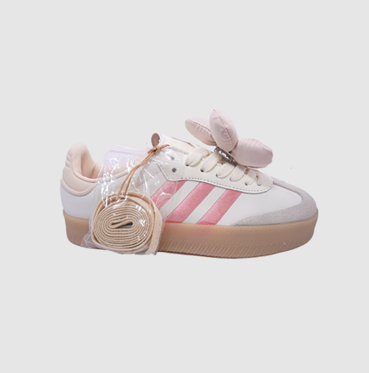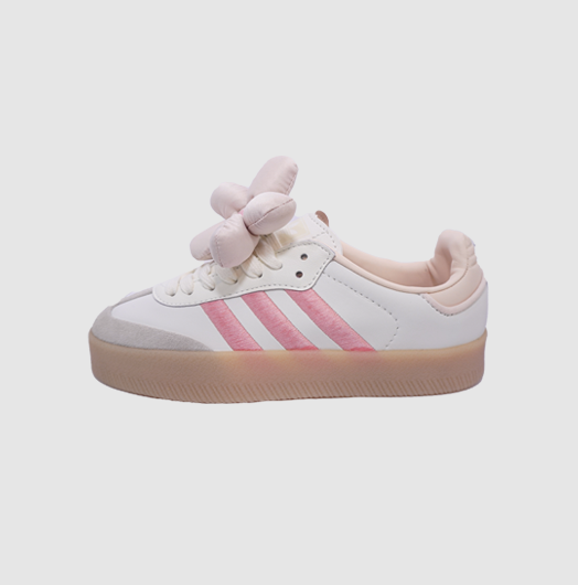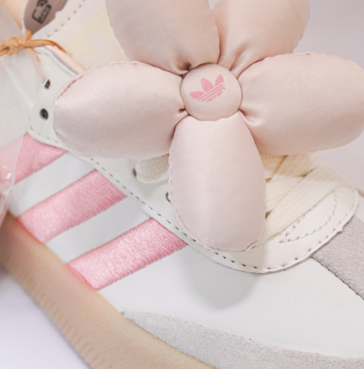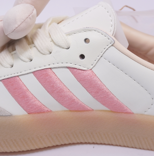 Las icónicas tres franjas laterales vienen en rosa pastel, bordadas con realmente cuidado para ofrecer textura premium. La lengüeta blanca mantiene el branding en rosa y naranja, en armonía con los tonos generales. La suela de goma tipo gum caramelo elevada aporta contraste visual y comodidad, mientras que detalles como la puntera “stitch‑and‑turn” suman un aire vintage renovado.