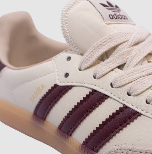 El upper en cuero premium color Wonder White aporta un look limpio y versátil, mientras que las tres franjas en Shadow Red y el talón a juego añaden contraste y carácter sin perder sobriedad. La icónica puntera en T refuerza la identidad Samba, y la suela gum ofrece excelente tracción, durabilidad y ese toque retro que nunca pasa de moda.