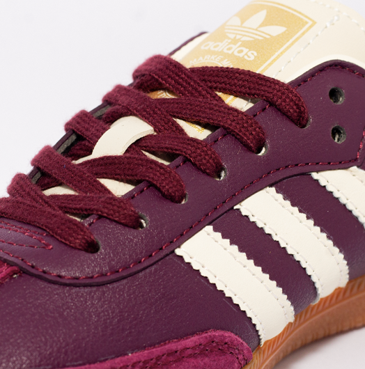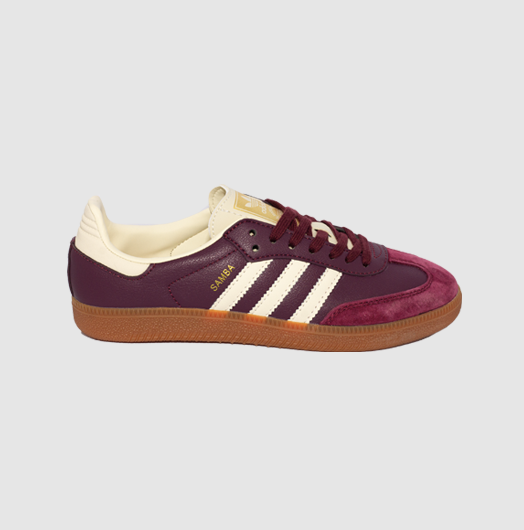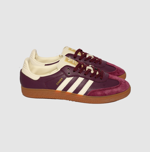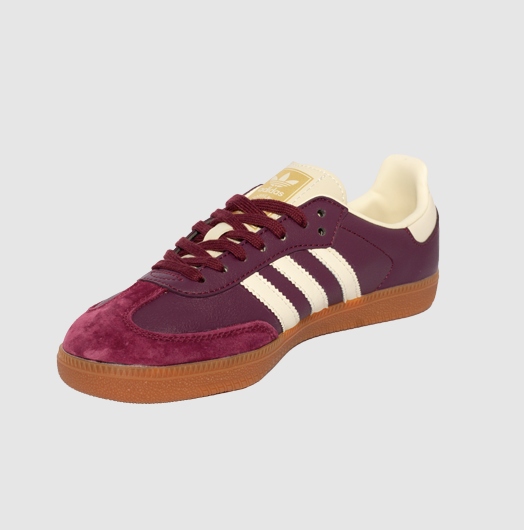 Un ícono del streetwear con un nuevo giro sofisticado. Esta versión de las Adidas Samba OG combina gamuza vinotinto en la puntera, cuero premium en tono burdeos y detalles en color crema que le aportan contraste y elegancia. Las tres franjas laterales, el talón y la lengüeta en tono blanco roto evocan un estilo retro, mientras que la suela de goma natural mantiene la esencia clásica del modelo. El toque final lo da el logo “SAMBA” en dorado sobre el panel lateral. Perfectas para quienes buscan un look urbano con carácter y estilo atemporal.