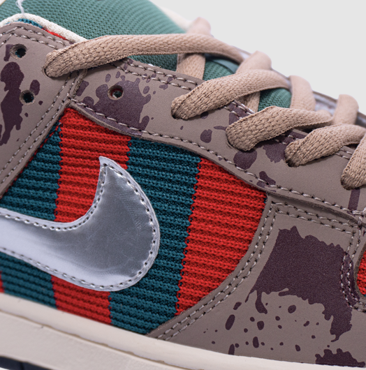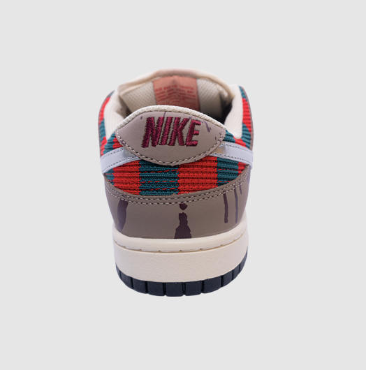 El upper combina paneles rayados en verde y rojo, evocando el suéter característico de Freddy Krueger, junto a superposiciones en cuero gris con efecto desgastado que simulan piel dañada. Los detalles de salpicaduras rojas tipo sangre, la lengüeta acolchada clásica de SB y el Swoosh negro refuerzan su estética oscura y agresiva, convirtiéndolas en una pieza de colección única.