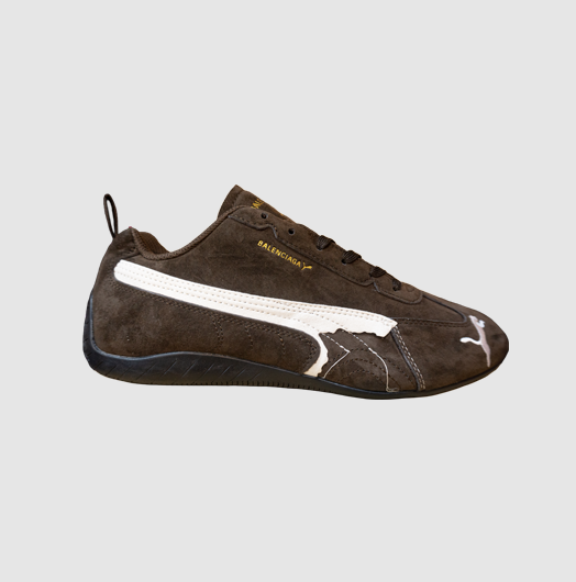Las Speed Cat Brown x Balenciaga fusionan la esencia del calzado automotriz con el enfoque vanguardista de la Maison. Inspiradas en los clásicos modelos racing, estas sneakers tienen una silueta estilizada y dinámica que envuelve el pie con elegancia. Su upper en tonos brown, elaborado en materiales premium, aporta un look cálido, moderno y extremadamente versátil.